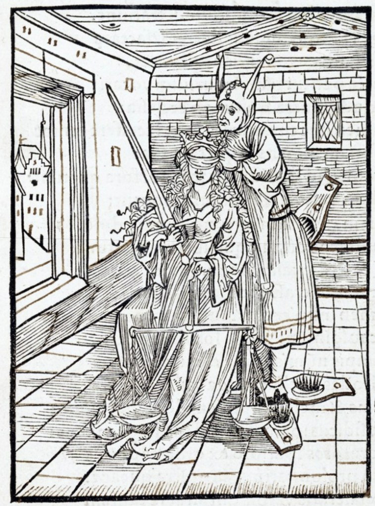Auf einem dieser Holzschnitte erscheint Justitia erstmals mit einer Augenbinde. Doch ihre Bedeutung ist eine völlig andere als die, die wir heute mit dem Symbol verbinden. Es ist nämlich ein Narr, der der Justitia die Augen verbindet. Wir sehen eine satirische Szene, die den Verfall der Rechtsprechung geißelt. Die Augenbinde symbolisierte hier Blindheit, Bestechlichkeitund die Verfehlung der Justiz durch unfähige Richter.