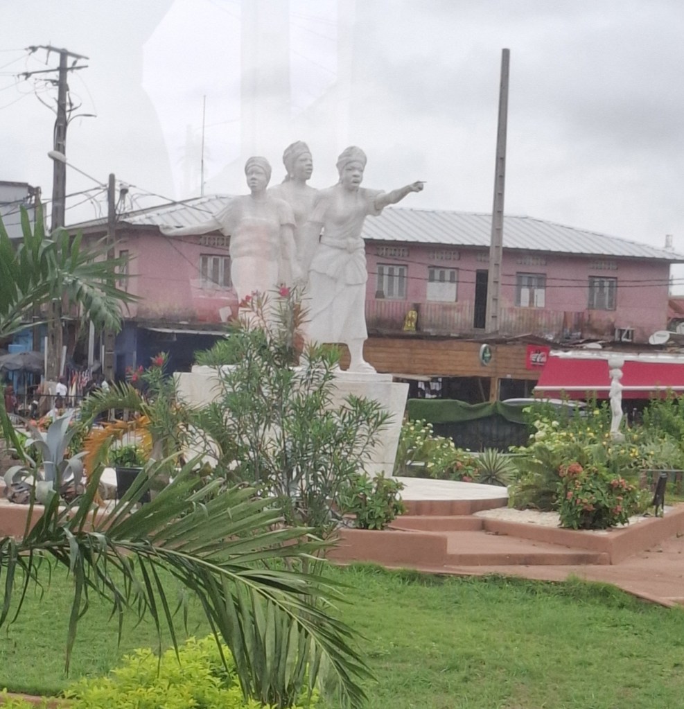 Hinweis: Das Foto zeigt eine Freiheitsstatue. Sie erinnert an den „Marsch der Frauen“ im Jahr 1949, als diese gegen die französische Kolonialherrschaft protestierten, weil ihre Männer inhaftiert worden waren. Der Protest endete tragisch. Die Frauen wurden verhaftet und schwer misshandelt; die Männer kamen nicht frei. Heute ist der Ort nahe der westafrikanischen Küste ein beliebter Touristenort mit einem interessanten Trachtenmuseum, das der Vorstellung der vielen Stammeskulturen, ihren Trachten und den sehr unterschiedlichen Siedlungsformen dient.
